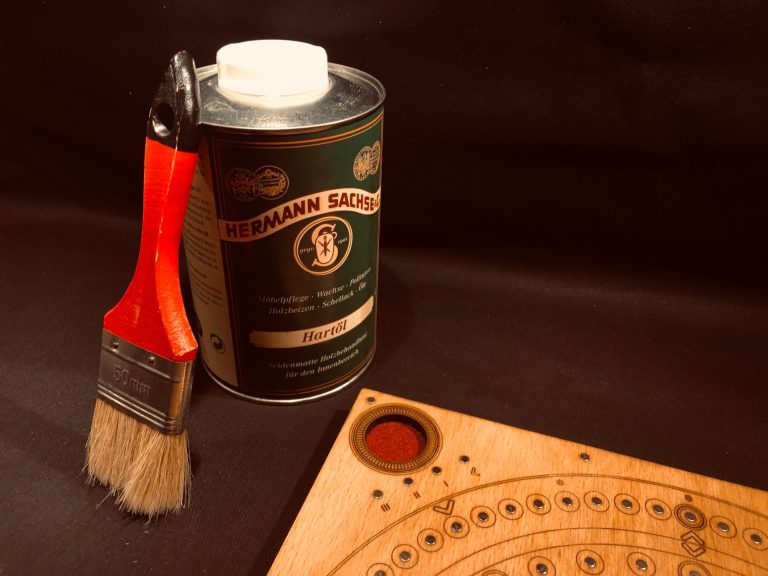 Wer es sehr gut mit seinem Spiel meint, kann aber alle 1 - 2 Jahre einen dünnen Film Holzöl aufbringen. Dabei dürfen die Magnete überstrichen werden, das ist kein Problem. Die Filzeinlagen kann man dabei abdecken - wenn man vorsichtig arbeitet ist das aber nicht nötig. Ansonsten einfach die Hinweise des Ölherstellers beachten.